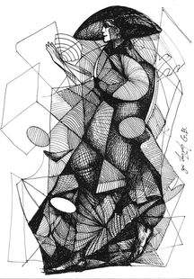 The exhibition brings together more than fifty drawings exploring the expressive potential of line, movement, and the transformation of the human figure. Executed in ink, Bugadze creates complex figurative compositions through dense networks of intersecting lines. Figures emerge from geometric structures, fragmented planes, and rhythmic cross-hatching, forming a visual language in which drawing functions simultaneously as both architectural construction and expressive gesture. In these works, the human body exists in a state of constant transformation, oscillating between suggestion and material presence, solidity and dissolution.